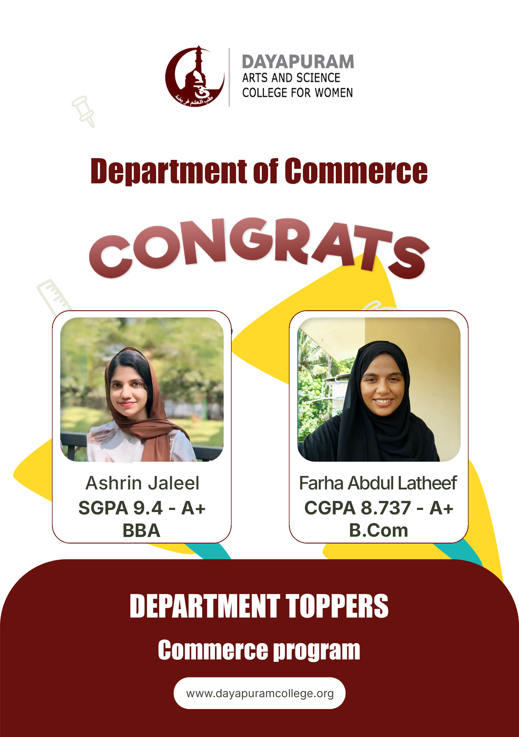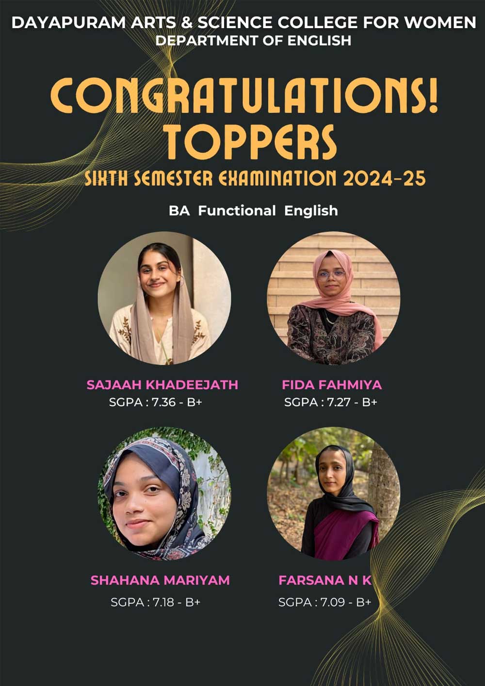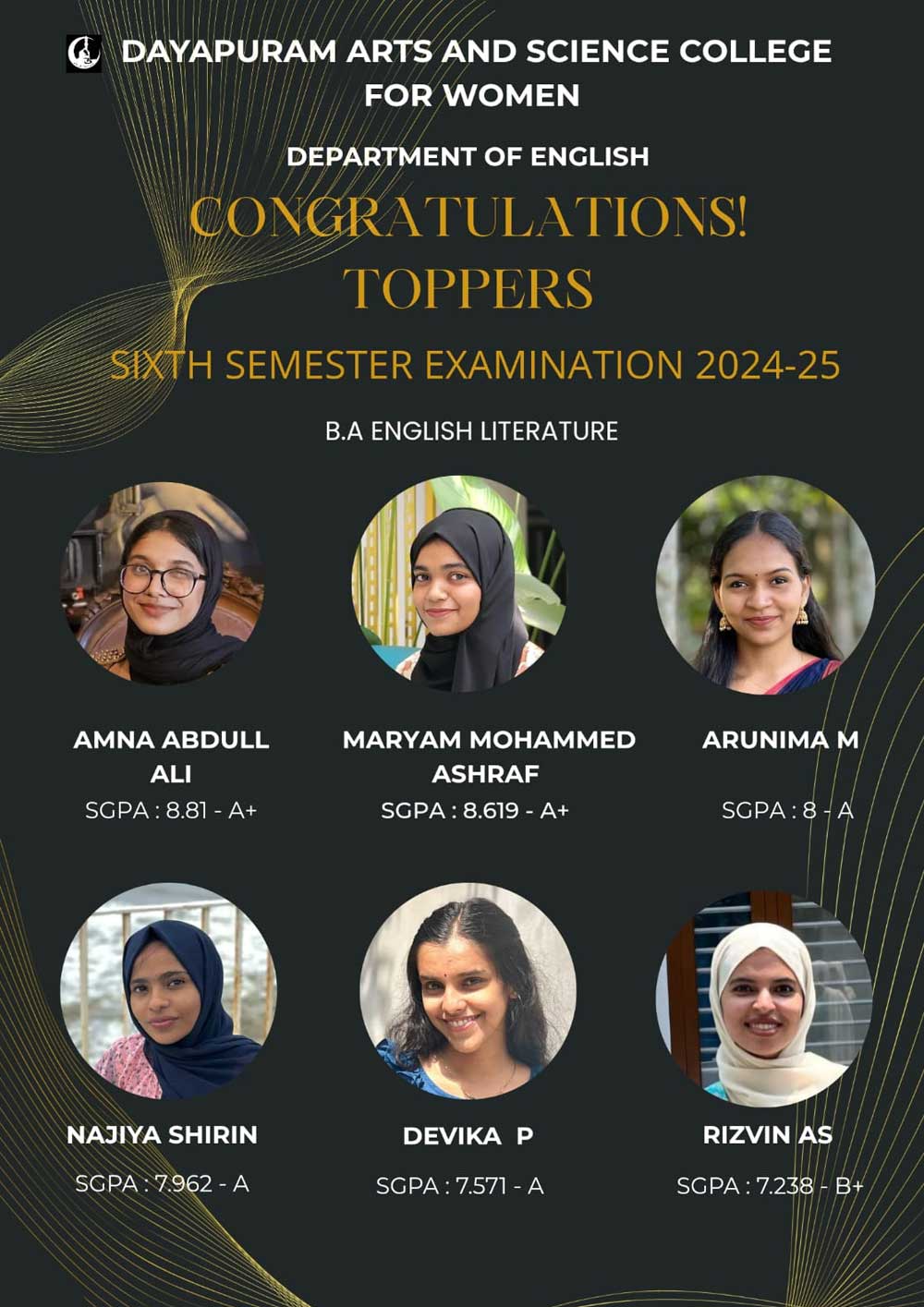 Dayapuram Arts and Science College for Women is a higher education centre for women empowerment and intellectual growth established in 2002. Affiliated to the University of Calicut, the college believes in furthering the foundational values of Dayapuram such as social equality, cultural justice and communal harmony through teaching, research and collective activities. Managed by academic volunteers from various parts of India, the college educates a number of orphan, destitute, socially and economically backward young girls in an attempt to work towards social development and hosts a number of intellectual pursuits