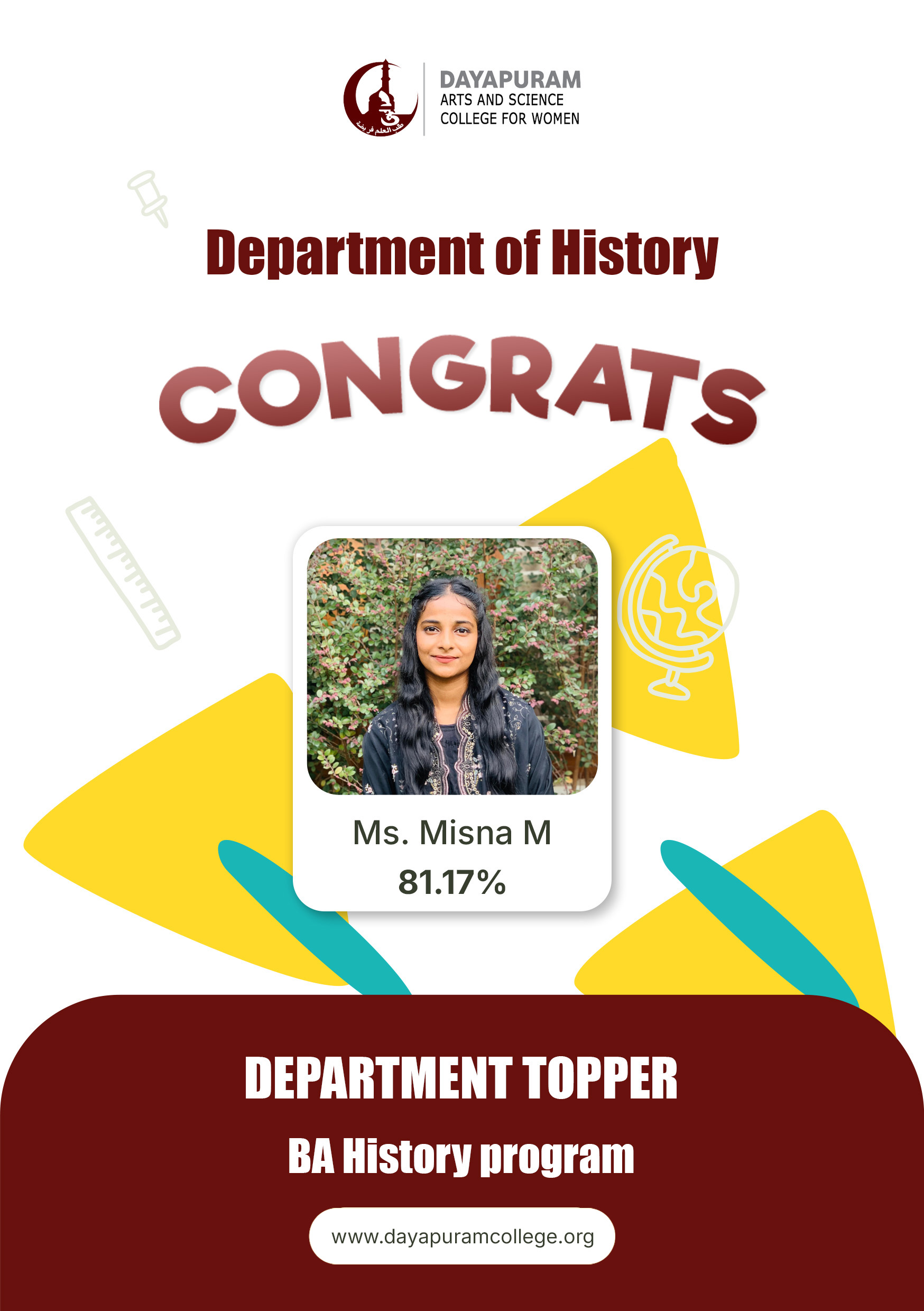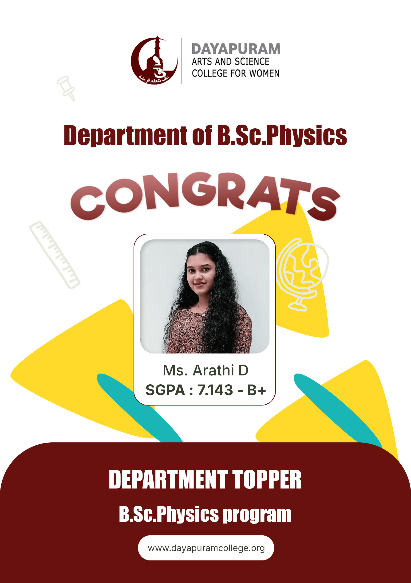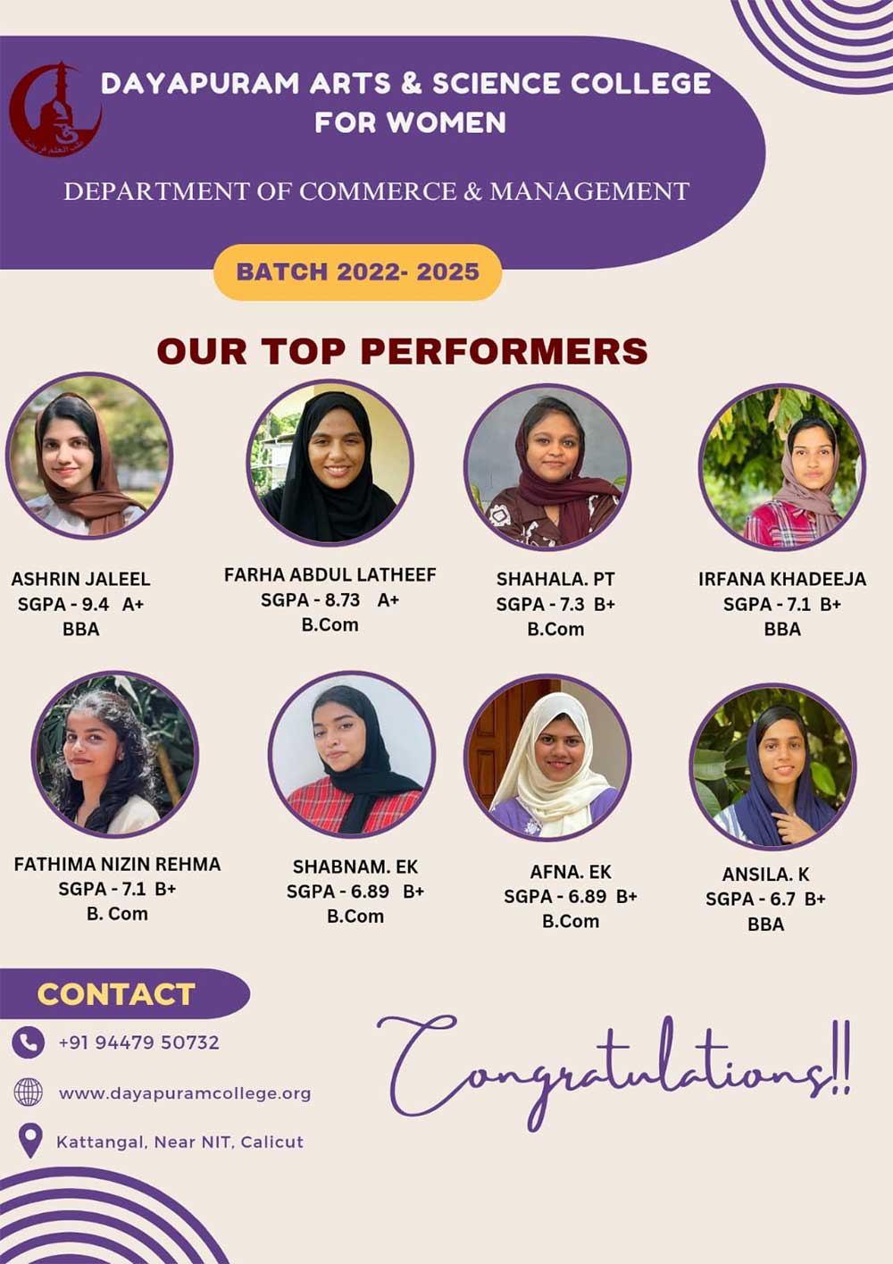 Dayapuram Arts and Science College for Women is a higher education centre for women empowerment and intellectual growth established in 2002. Affiliated to the University of Calicut, the college believes in furthering the foundational values of Dayapuram such as social equality, cultural justice and communal harmony through teaching, research and collective activities. Managed by academic volunteers from various parts of India, the college educates a number of orphan, destitute, socially and economically backward young girls in an attempt to work towards social development and hosts a number of intellectual pursuits